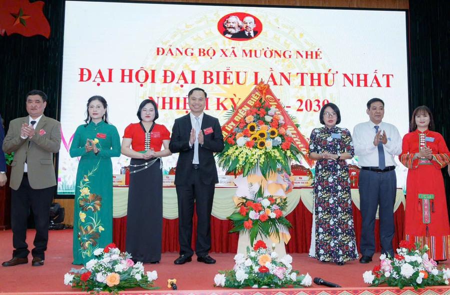 Lãnh đạo Ban Tuyên giáo và Dân vận Tỉnh ủy Điện Biên tặng hoa chúc mừng Đại hội Đảng bộ xã Mường Nhé lần thứ nhất.