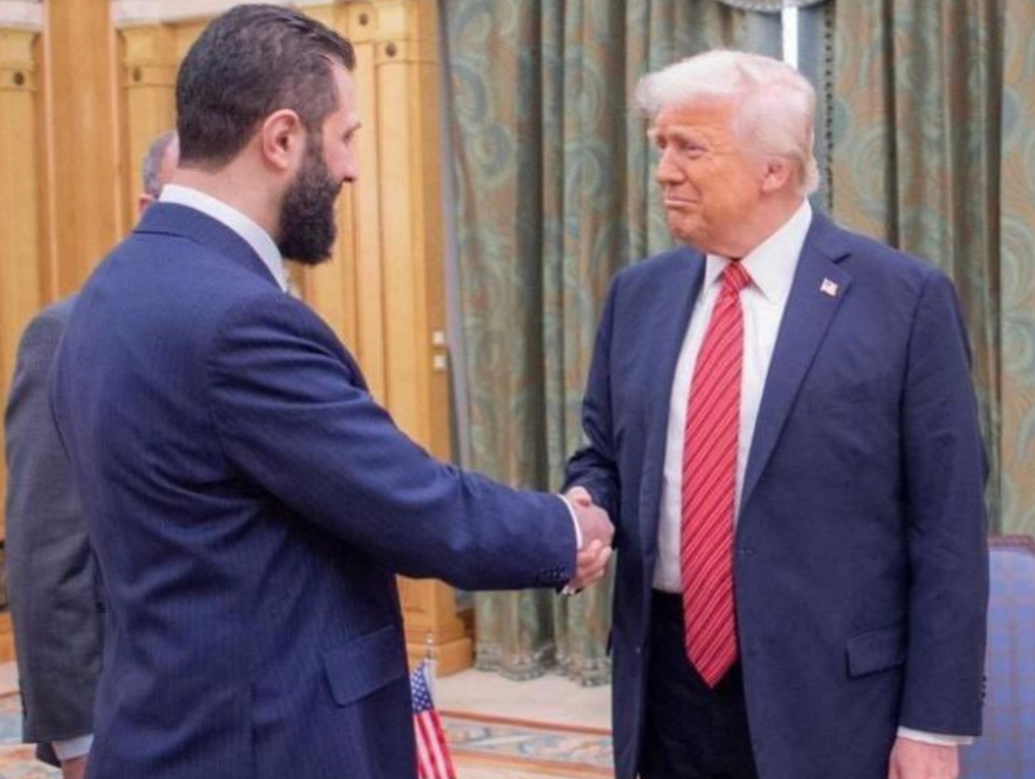 Tổng thống Mỹ Donald Trump và Tổng thống lâm thời Syria Ahmed al-Sharaa trong cuộc gặp hồi tháng 5/2025 tại Ả Rập Xê Út. Ảnh chụp màn hình.