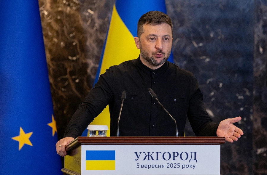 | Tổng thống Ukraine Zelensky trong cuộc họp báo với Chủ tịch Hội đồng châu Âu tại Uzhhorod hôm 5 tháng 9. |