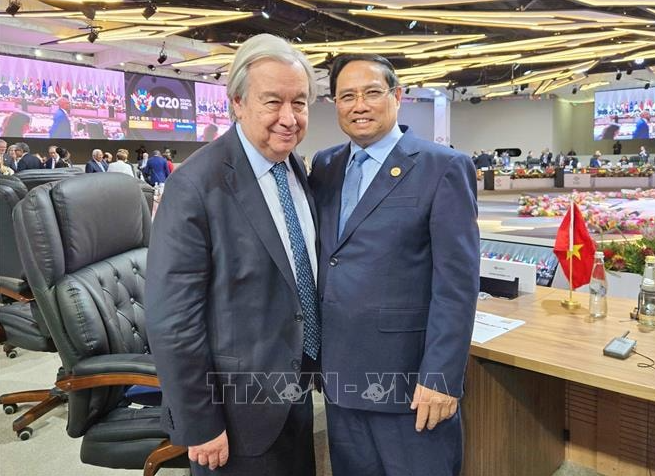 Gặp lại Tổng Thư ký LHQ Antonio Guterres, Thủ tướng Phạm Minh Chính bày tỏ ủng hộ quan điểm, cách tiếp cận của Tổng Thư ký tại các thảo luận của G20 năm nay, nhất là cải cách hệ thống tài chính quốc tế, chuyển đổi xanh và thu hẹp khoảng cách phát triển; đánh giá cao nỗ lực của Tổng Thư ký trong việc bảo đảm G20 gắn với các mục tiêu của LHQ, hỗ trợ các nước đang phát triển thực hiện các Mục tiêu phát triển bền vững (SDGs).