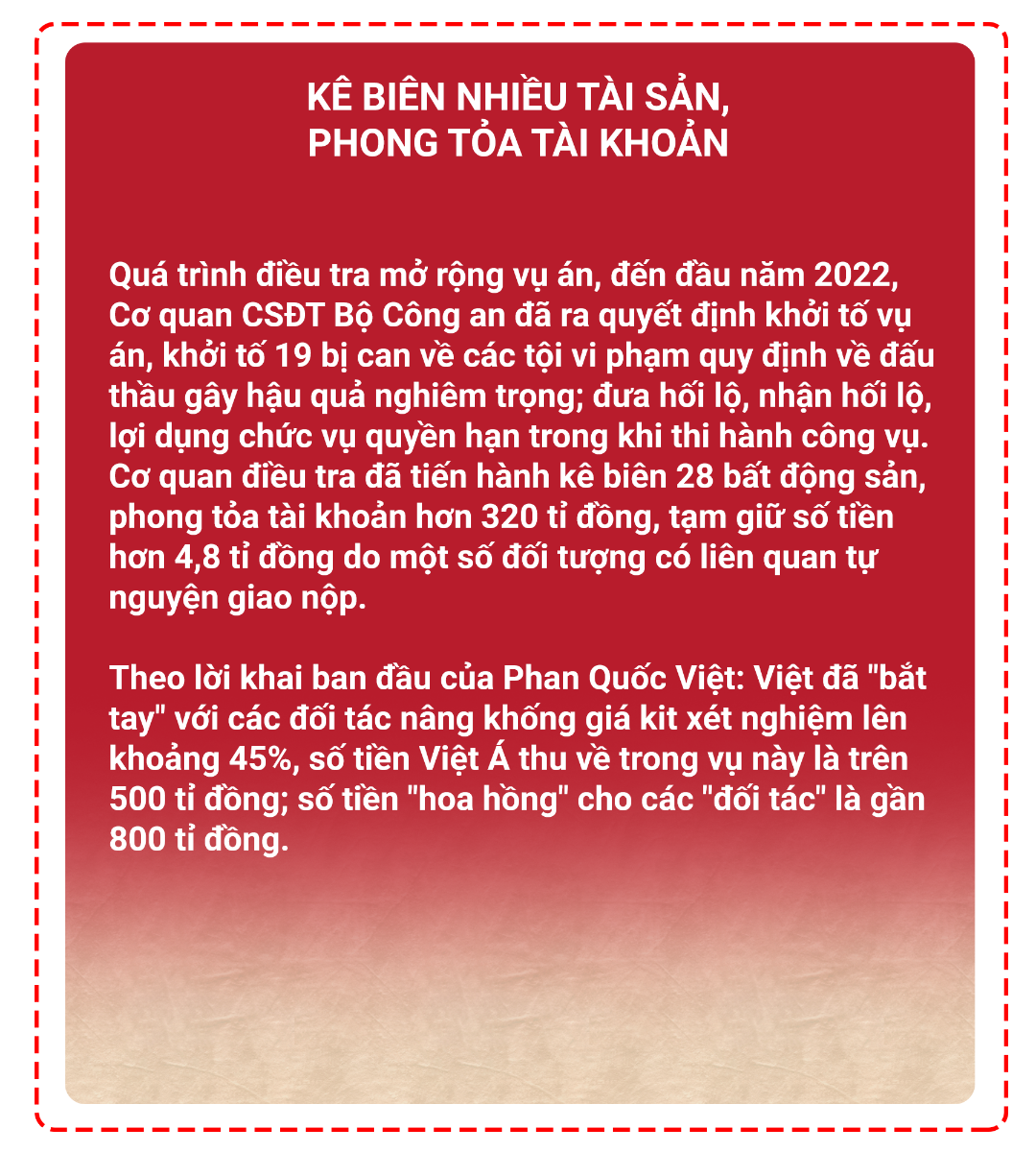 Kết quả điều tra và đấu tranh với các đối tượng, cơ quan chức năng xác định Công ty Việt Á do Phan Quốc Việt thành lập, giữ chức Chủ tịch HĐQT kiêm Tổng Giám đốc. Tháng 4/2020, Công ty Việt Á được Bộ Y tế cấp phép đăng ký lưu hành cho sản phẩm kit xét nghiệm Covid-19. Đến cuối năm 2021, Công ty Việt Á đã cung ứng kit xét nghiệm Covid-19 cho trung tâm kiểm soát bệnh tật (CDC) và các cơ sở y tế của 62 tỉnh, thành phố trên cả nước với doanh thu gần 4.000 tỉ đồng.