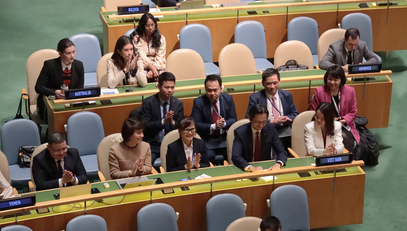 Đoàn Việt Nam sau khi nghe Chủ tịch Đại hội đồng LHQ công bố kết quả bỏ phiếu. (Ảnh: Thanh Tuấn/Phóng viên TTXVN tại Mỹ).