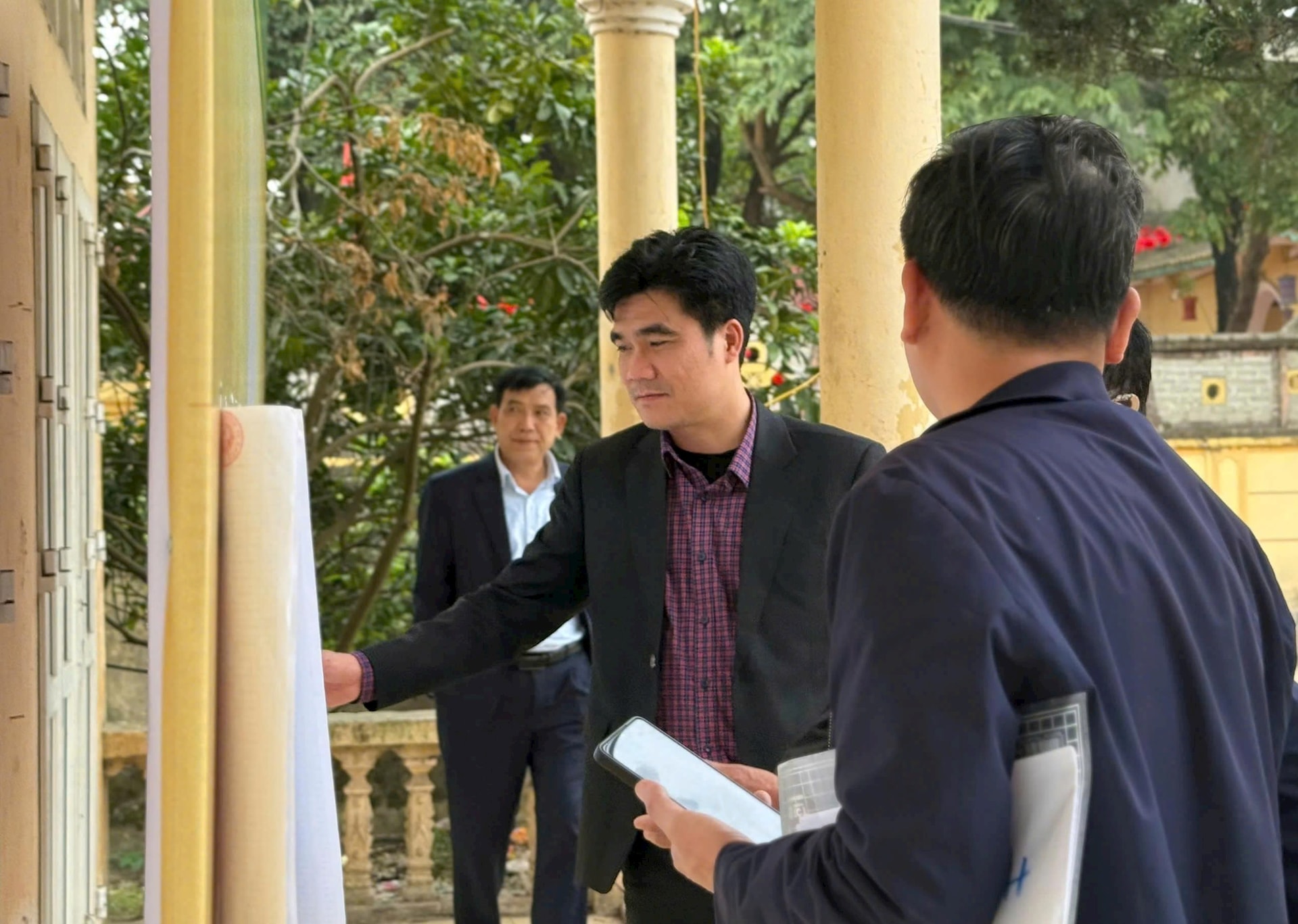 Chủ tịch UBND xã Hương Sơn Lê Văn Trang kiểm tra công tác chuẩn bị bầu cử. Ảnh: VB