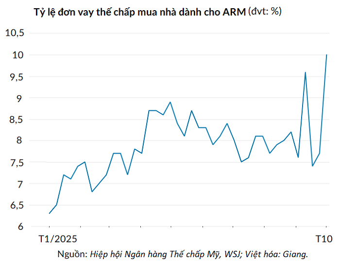 Theo Hiệp hội Ngân hàng Thế chấp Mỹ, khoảng 10% đơn vay thế chấp mua nhà trong tuần kết thúc vào ngày 3/10 là dành cho ARM - mức cao nhất kể từ năm 2023. Vào đầu năm 2021, khi lãi suất thế chấp ở gần mức thấp kỷ lục, tỷ lệ này còn chưa đến 3%.