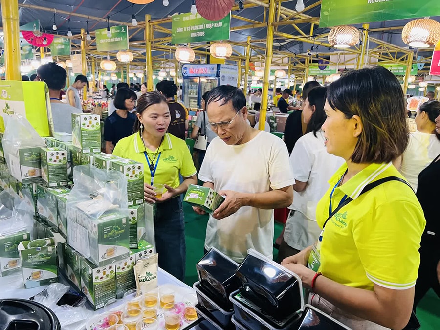 Người tiêu dùng tìm hiểu sản phẩm nông sản của các tỉnh, thành phố tại chương trình “Tự hào nông sản Việt” năm 2025 do Sở Nông nghiệp và Môi trường Hà Nội tổ chức. Ảnh: Hương Giang
