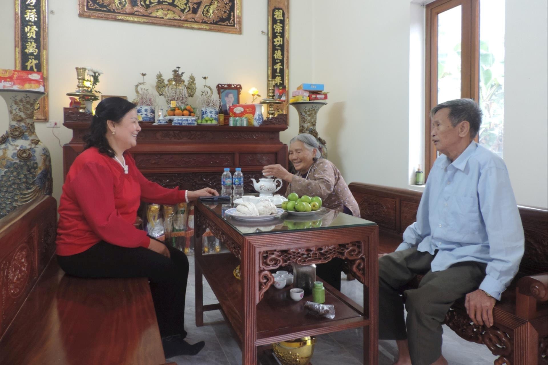 Bà Nguyễn Thị Minh, Trưởng ban Công tác Mặt trận thôn Linh Quy Đông thay mặt các đoàn thể tặng hoa chúc mừng gia đình bà Nguyễn Thị Tình. Ảnh: VT