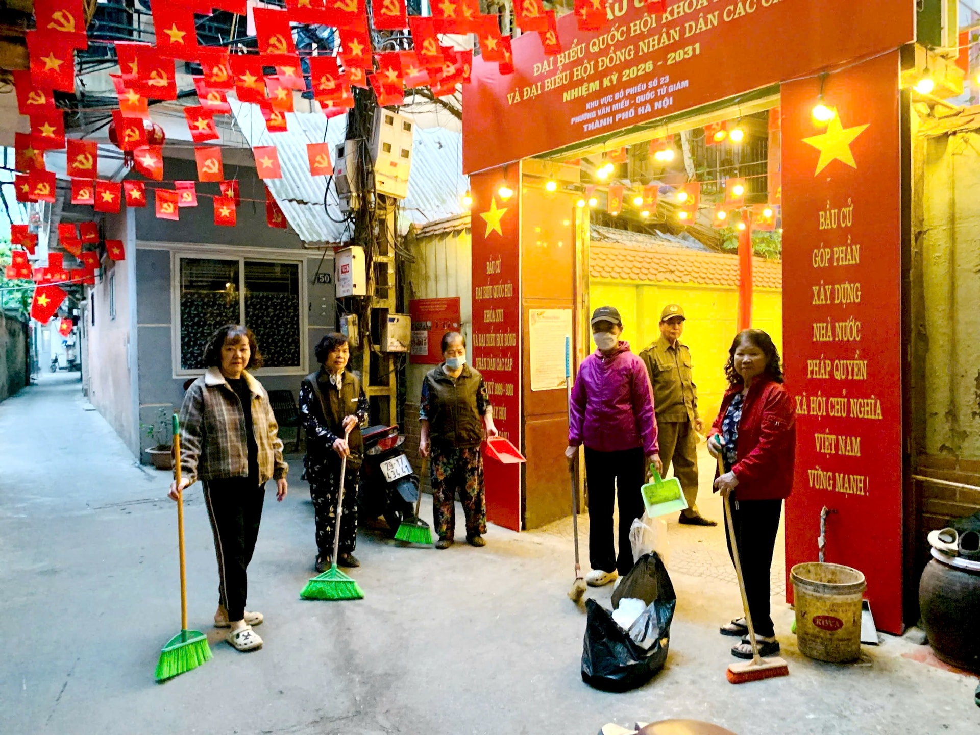 Phụ nữ phường Xuân Đỉnh vệ sinh, trang trí quanh khu vực bầu cử. Ảnh: MT