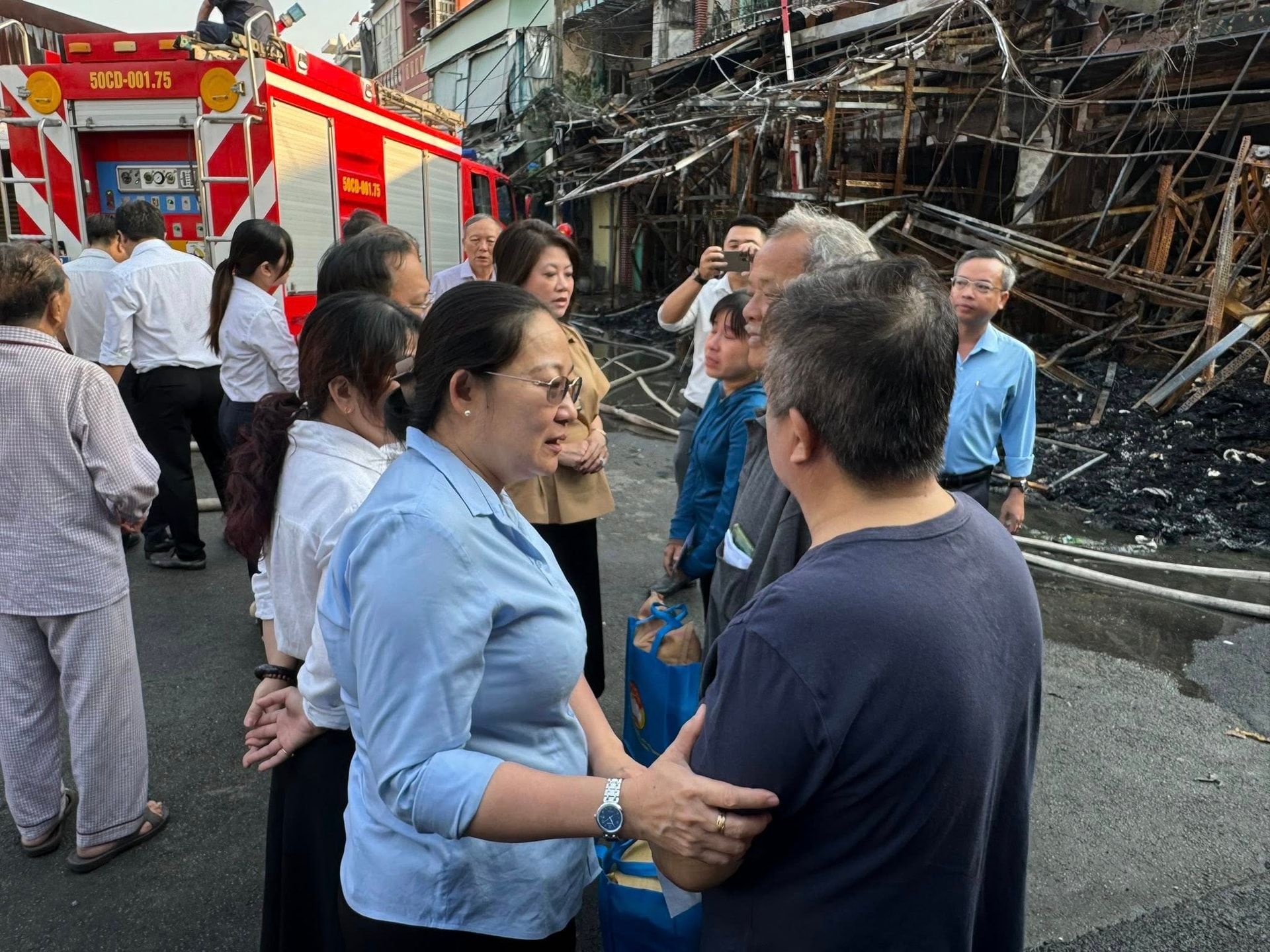 Lãnh đạo phường Bình Đông thăm hỏi, động viên người dân có nhà bị cháy. Ảnh: M.Vũ