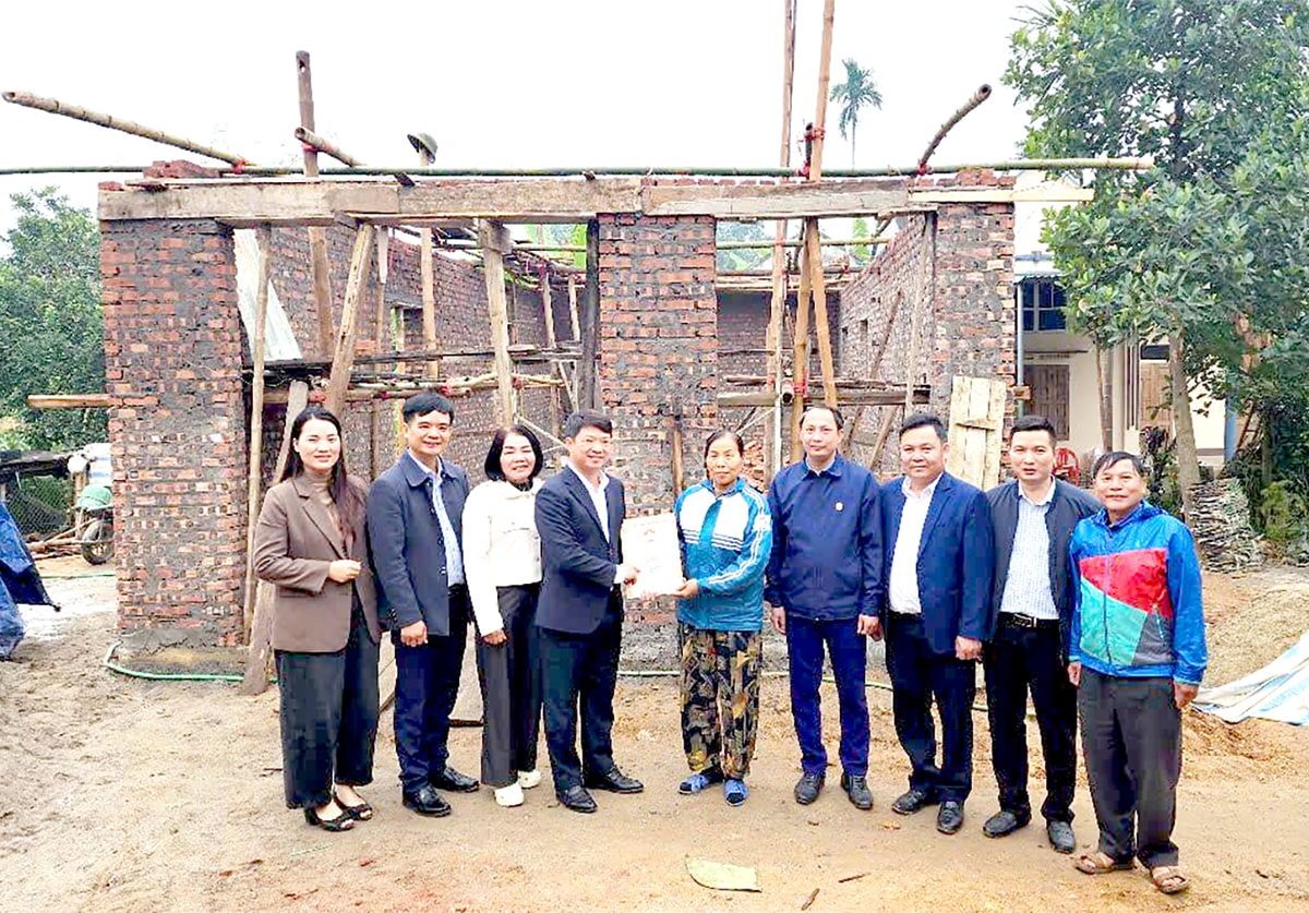 Bí thư Đảng ủy, Chủ tịch HĐND xã Lê Văn Quân cùng cán bộ MTTQ và các đoàn thể xã Ba Vì trao kinh phí hỗ trợ xây nhà đại đoàn kết cho hộ gia đình bà Nguyễn Thị Phú ở thôn Khánh Chúc Bãi. Ảnh: Xã Ba Vì